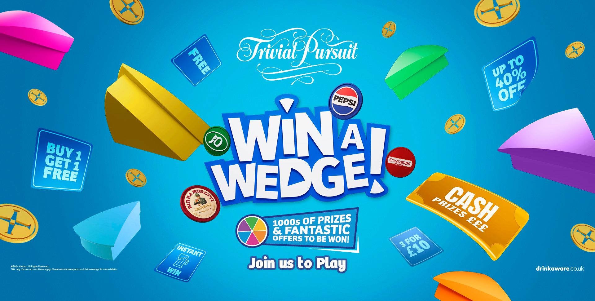 Scan the QR code in pub to play. Answer all 6 Trivial Pursuit questions correctly for an instant reward or fantastic offer. And here’s the best bit… win or lose, you could win £1,000 each week!